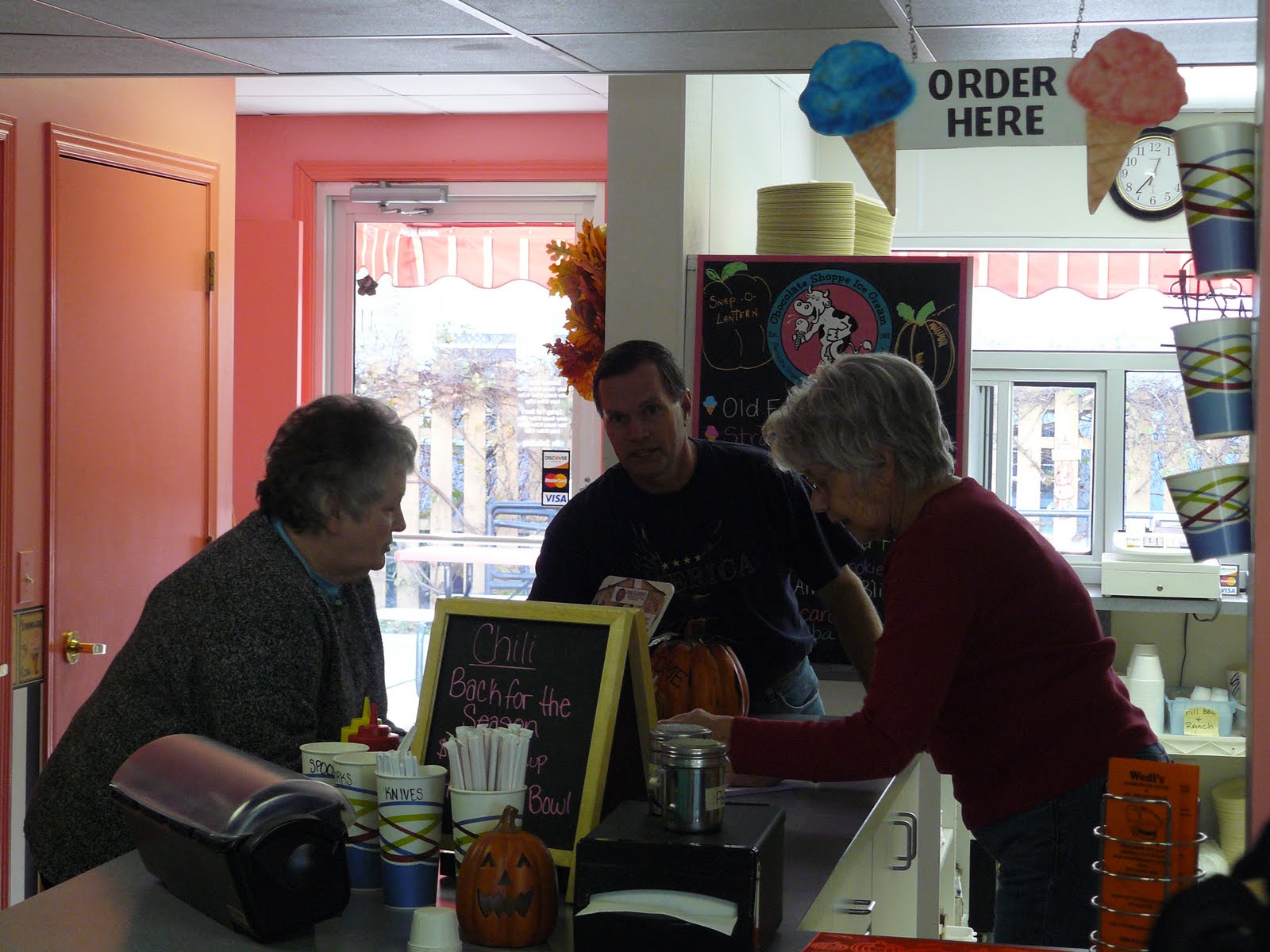 The place was small. At first all the tables were taken and we had to sit at a counter. But by time we ordered our food, a table became available. Above, Louise is placing her order.